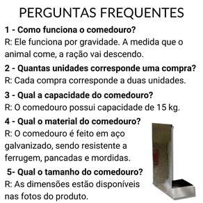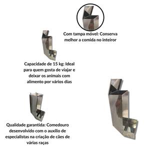 Kit 2 comedouro de cães 15 kg galvanizado especial ---enviamos em até 24h úteis--- ---garantimos sua satisfação ou devolvemos o seu dinheiro--- Kit 2 comedouro automático 15 kg cães aço galvanizado Agora você pode colocar de uma vez só toda a ração do seu bichinho de estimação. O comedouro automático gs é resistente a ferrugem, é fácil de lavar e não contamina a comida do seu mascote. O melhor é que a ração não fica velha, murcha ou estragada. Você coloca a ração uma vez e o seu cão sempre terá comida fresca. É extremamente resistente, pois é feito em aço galvanizado, projetado para aguentar eventuais choques. Pode ser para: -alimentar vários cães em canis. -deixar comida suficiente para o cão em caso de alguma viagem -ter um lugar para armazenar a ração Largura da calha de alimentação: 29 cm Profundidade da calha de alimentação: 9 cm Comprimento da calha de alimentação: 13 cm Altura total: 65 cm Largura total: 29 cm Peso do comedouro: 2,1 kg Capacidade: 15 kg Imagens meramente ilustrativas Incluso no pacote: 2 unidades comedouro para cães 15 kg Marca: Não Informado
