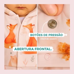O casaco possuí botão de pressão na frente para facilitar a troca, capuz para evitar que o bebê pegue friagem.