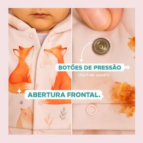 O casaco possuí botão de pressão na frente para facilitar a troca, capuz para evitar que o bebê pegue friagem.