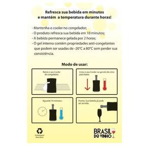 Marca: Brasil do Vinho País: Brasil Tipo: Cooler térmico Cores: Conforme título do anúncio Capacidade: Uma garrafa de 750ml Material: Poliéster