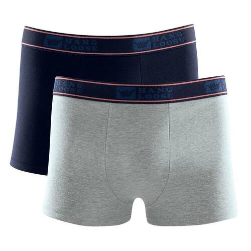 Kit 2 cuecas boxer cotton Hang Loose, são super confortáveis. Ideal para aconpanhar em seu dia a dia. Sua composição: Cinza Mescla Escuro: 48% algodão, 48% poliéster e 4% elastano. Demais cores: 95% algodão e 5% elastano. Conta com cós em elástico aparente.