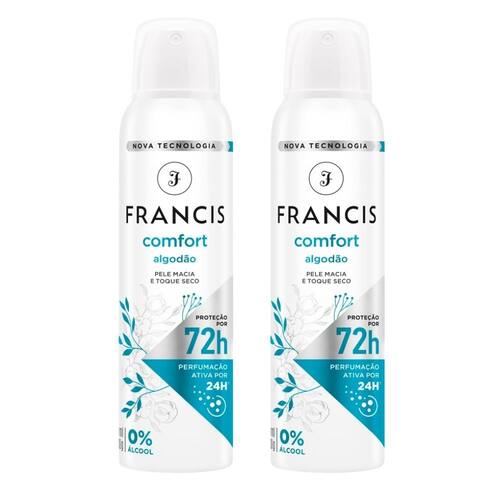 Francis Desodorante Comfort Algodão 150ml Perfume durante todo o seu dia, com pele perfumada e macia. Modo de usar: 1. Agite antes de usar. 2. Aplique a 15cm de distância das axilas. 3. Espere secar antes de se vestir. 4. Não usar se a pele estiver irritada ou lesionada Benefícios: 72h de proteção e 24h de perfumação ativa