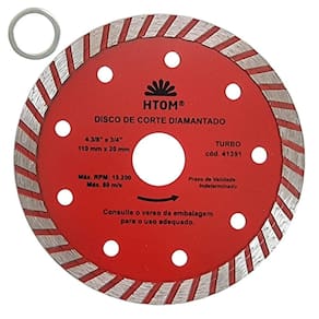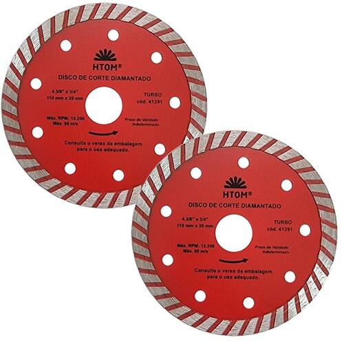 Kit 2 Discos De Corte Diamantado Turbo 110Mm Seco Para Mármore Kit com 2 Discos de Corte Diamantado Turbo 110mm x 20mm HTOM Disco de Corte Diamantado Turbo 110mm indicado para corte com Serra Mármore Makita . Corte a seco ou úmido em concreto baixo mármore, basalto, MPA, alvenaria, tijolo, granito, telha, ardósia e cerâmica. - Marca: HTOM - Referência: HTOM-41391-2X - Kit exclusivo com 2 discos turno para serra mármore - Diâmetro: 110 mm - Furo: 20mm - Acompanha anel para 16mm - Altura da borda de corte: 2.2mm - Largura da borda de corte: 8.5mm - Espessura: 1.8mm - Rotação máxima: 13.200 rpm - Combina cortes rápidos e acabamento - Corte a seco ou úmido refrigerado - Indicador para corte sem água em Concreto baixo MPA, alvenaria, tijolo, telha, ardósia e cerâmica - Indicado para corte com água em concreto alto MPA, mármore e granito. - Use sempre EPI - Peso: 95 gramas - : 90 dias