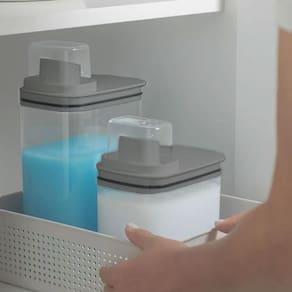 O dispenser de 1,5 litros é ideal para armazenar produtos de limpeza complementares, como detergentes especiais ou alvejantes.