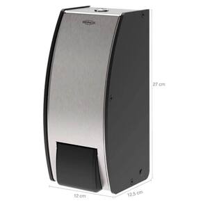 Garantia: 90 dias / Peso total: 1,66kg / Cor predominante: preto / Referência: 7794464325221; Dimensões de cada dispenser: 12cm (C) x 12,5cm (L) x 27cm (A); Capacidade: 800ml cada; Acionamento: manual; Abastecimento: sabonete líquido ou álcool em gel; Trava: com sistema por chave; Incluso: chave, parafusos e buchas. Conteúdo: 2 dispensers porta sabonete/álcool gel. Materiais: aço inox escovado e polipropileno.
