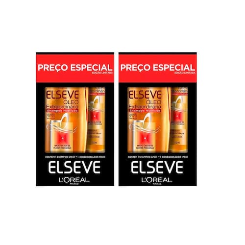SHAMPOO + CONDICIONADOR ELSEVE ÓLEO EXTRAORDINÁRIO NUTRIÇÃO 375ML+170ML PREÇO ESPECIAL Para cabelos secos. Suavidade infinita. Brilho excepcional. Vitalidade deslumbrante. Umectação intensa sem pesar. Definição duradoura anti-frizz. Cachos soltos, ultra macios e brilhantes. Fios em forma de espiral tendem a se ressecar mais facilmente e precisam de umectação. Por isso os laboratórios L'Oreal trouxeram o poderoso Óleo de Coco misturado aos Óleos de Flores Preciosas. -Umectação intensa sem pesar. O primeiro passo para cachos hidratados até as pontas. -Definição duradoura e anti-frizz. Os cachos mantem sua forma com brilho e maciez. -Com os fios modelados e umectados sua rotina no day after fica mais fácil. Cabelos cacheados a crespos são únicos e merecem um cuidado todo especial, principalmente os que estão em transição. Por isso Elseve trouxe o segredo do óleo de coco e de óleos de flores preciosas para uma umectação intensa sem pesar. O resultado são 48 horas de definição e uma melhor rotina no day after. Modo de usar: Aplique o Shampoo Elseve Óleo Extraordinário Nutrição sobre os cabelos molhados e massageie delicadamente. Enxágue em seguida. Após o uso do Shampoo aplique o condicionador Elseve Óleo Extraordinário Nutrição sobre os cabelos molhados e massageie delicadamente. Enxágue em seguida. Para melhores resultados use a linha completa Elseve Óleo Extraordinário Nutrição. Ean: 7899706164375 Ean: 7899706164375