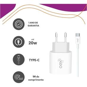 Kit carregador rápido 2 em 1 com cabo Type-C, 20W de potência, tecnologia Power Delivery (PD), cabo de 1 metro, entrada bivolt automática (127V-220V), material resistente em plástico ABS, design compacto e portátil.Tipo