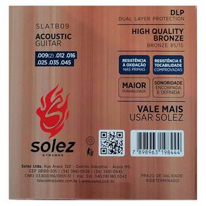 O Encordoamento para Violão de Aço Solez .009 SLATB09 é uma escolha excepcional para músicos que buscam um desempenho premium e uma sonoridade vibrante em seus violões. Desenvolvido com precisão e utilizando materiais de alta qualidade, este encordoamento oferece uma experiência musical enriquecedora. Principais Características: Calibre .009: As cordas finas com calibre .009 proporcionam uma resposta rápida e uma tocabilidade fácil. Essa escolha de calibre é ideal para músicos que buscam facilidade na execução de solos e acordes, oferecendo uma sensação suave sob os dedos. Material em Bronze 85/15: Fabricado com a liga de bronze 85/15, conhecida por equilibrar brilho e calor tonal. Esse material contribui para um som rico, com agudos expressivos e graves encorpados. Sustain Aprimorado: O encordoamento Solez .009 oferece um sustain aprimorado, permitindo que as notas se prolonguem de maneira expressiva. Isso é particularmente vantajoso para músicos que desejam criar linhas melódicas e solos envolventes. Versatilidade Musical: Adequado para uma variedade de estilos musicais, desde o fingerstyle suave até o ritmo vigoroso. A versatilidade desse encordoamento o torna uma escolha excelente para músicos que exploram diferentes gêneros. Tecnologia Anti-Corrosão: As cordas são revestidas com uma tecnologia anti-corrosão que contribui para a durabilidade e a longevidade do encordoamento. Isso é particularmente útil em ambientes com condições climáticas desafiadoras. Qualidade de Construção: O encordoamento Solez é fabricado com padrões rigorosos de qualidade, garantindo consistência na produção e um desempenho confiável. Cada corda é projetada para oferecer uma resposta precisa e equilibrada. Resistência ao Desgaste: Projetado para resistir ao desgaste causado pelo uso regular, o encordoamento Solez .009 mantém sua integridade mesmo em condições de alto desempenho. Isso se traduz em uma vida útil mais longa das cordas. Indicado para Violões de Aço: Especificamente projetado para violões de aço, esse encordoamento atende às especificações técnicas desse tipo de instrumento, garantindo uma adaptação perfeita e um som otimizado. O Encordoamento Violão de Aço Solez .009 SLATB09 é uma escolha premium para músicos que exigem o melhor de seu violão. Seja você um profissional experiente ou um entusiasta dedicado, esse encordoamento oferece um equilíbrio tonal refinado e uma resposta excepcional, elevando a qualidade sonora do seu instrumento.
