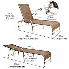 ESPECIFICACOES TECNICAS: Espreguicadeira Catar: - Altura: 37 cm - Largura: 62 cm - Profundidade: 195 cm - Suporta ate 200 kg - Com regulagem