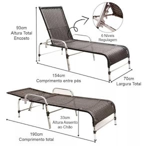ESPECIFICACOES TECNICAS: Espreguicadeira Catar: - Altura: 37 cm - Largura: 62 cm - Profundidade: 195 cm - Suporta ate 200 kg - Com regulagem