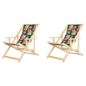 Conjunto com 2 cadeiras reclináveis em madeira maciça (mogno ou eucalipto), acabamento natural sem pintura. Dobráveis, com 4 níveis de altura, descanso de braço e tecido hidro-repelente reforçado. Suportam até 100kg.