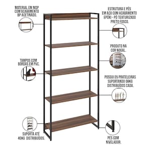 Com o Kit 2 Estantes Multiuso Escritório Industrial 5 Prateleiras Areta 186x80cm C01 Nogal - Lyam Decor , o conceito industrial ficará evidente no seu ambiente, tornando o mesmo muito mais moderno, sofisticado e organizado, garantindo isso com 05 prateleiras que deixam tudo prático e funcional. Uma característica muito forte dos móveis industriais é a união do tubular de estrutura exposta com a madeira, que dão todo o charme para agregar no estilo que está entre os mais buscados no ramo de arquitetura e decoração. Adquira já a sua! Dimensões do produto (L x A x P) 80 x 186 x 30 cm Medidas Internas: Altura da prateleira: 39,7 cm Largura da prateleira: 76 cm Características: 05 prateleiras produzidas em MDP, com acabamento em BP acetinado. Pés em tubo de aço com sapatas niveladoras e acabamento em pintura texturizada epóxi, responsável por criar alta resistência á umidade e produtos químicos, facilitando também na limpeza e manutenção. Fita de borda em PVC. Solda com acabamento suavizado. Produto na cor Nogal. Suporta até 8 kg por prateleira. Produto entregue desmontado, acompanha manual de montagem. Para a limpeza, utilize flanela seca. Evite contato com produtos químicos (solventes, thinner, acetona, etc) e não utilize nenhum tipo de esponja de aço. Observações importantes: A montagem será de responsabilidade do comprador; Responsabilizamo-nos pela entrega em todo território nacional, até onde as rodovias alcançam, entregas fluviais ou aéreas devem ser cotadas a parte; As imagens são ilustrativas, não acompanham objetos de decoração e eletrônicos; Não nos responsabilizamos, no ato da entrega, por subir escadas/elevadores ou transporte por guincho em apartamentos. Eventuais despesas são de responsabilidade do comprador; Confira as dimensões do produto e certifique-se de que passará normalmente por supostos elevadores, portas, escadas e/ou corredores de sua residência; NA