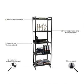 Características do Produto Material da Estrutura: MDP BP 15 mm/Aço. Peso Suportado: 5 Kg por prateleira. Tonalidade: Preto Onix. Acabamento: BP Acetinado e Pintura Epóxi. Escala de Brilho: Fosco. Possui Prateleiras: Sim. Material das Prateleiras: MDP. Possui Pés: Sim, Aço com pintura epóxi. Possui Rodízios: Não. Diferenciais: - Design moderno. - Fita de borda em PVC. - Pés niveladores. - Solda com acabamento suavizado. - Estrutura reforçada. Sistema de Montagem: Minifix / Cavilhas / Parafs. Manual de Montagem: Sim. Complexidade da Montagem: Baixa. Conteúdo da Embalagem: 2 Estantes. Volumes: 2 Volumes. Garantia do Fabricante: 3 meses contra defeito de fabricação. Montagem: Recomendamos que seja feita por um . Recomendação de Limpeza: Utilize pano levemente úmido.