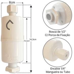 Kit 2 Filtro Refil Bebedouro Pressão Coluna Bag Compatível com Várias Marcas Kit com 2 peças - Filtro Refil Zuflow compatível com Bebedouro de Coluna de diversas marcas Compatível com as marcas abaixo e várias outras: - IBBL BAG bag 40, bag 80 - Karina K40i, K40 K40ci - masterfrio Mf40 Mfa40 - Begel - Belliere - Tecnigel - Diplomat - Pologel - WFS - WDS - entre várias outras. Fazer a troca do filtro é realmente muito simples e leva poucos minutos. De um lado ele tem uma rosca de 1/2 com uma porca travante e do outro lado um encaixe de 1/4, que pode ser ligado direto em mangueiras ou tubos metálicos do aparelho. A recomendação é de que o filtro deve ser trocado a cada 6 meses, ou antes, caso estime que seja consumido 3000 litros antes do prazo ou observe redução do fluxo de água. O filtro remove o cloro da água, elimina sabores, retém partículas de sujeira, barro, ferrugem, entre outras partículas sólidas. As marcas e produtos citados e ilustrados são propriedades de seus respectivos fabricantes e aparecem apenas para demonstrar a compatibilidade deste produto. Fabricante/marca do refil: Zufer REF: ZF-2210 Eficiência da retenção de partículas: Classe III Eficiência da redução de Cloro livre: Aprovado Produto de acordo com a norma ABNT NBT 16098:2012. Elemento filtrando destinado ao uso em água que atenda a portaria N 2.914/2011 do Ministério da Saúde. Marca: Não Informado Ean: 7892449404555