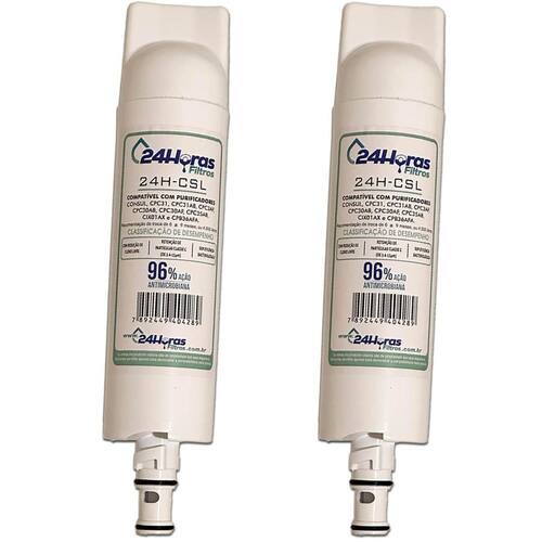 Kit 2 Filtro Refil Consul Compatível Purificador CPC 30 35 36 31 34 CIX01 CIX06 Kit 2 unidades - Filtro Refil 24H-CSL compatível com os Purificadores de Água Consul Compatível com todos os modelos, linha Bem Estar, Facilite, entre outras, sendo: Os que usam o refil CIX01 / CIX01AONA CPC30 - CPC35 - CPC36 Os que usam o refil CIX06 / CIX06AONA CPC31 - CPB34 - Troca Rápida e Fácil manual passo a passo é enviado junto . - Filtro deve ser trocado de 6 a 9 meses, conforme manual do aparelho. - O filtro elimina: Cloro, Gostos, Cheiros, Partículas Sólidas e ajuda a Elevar o pH. - Cada filtro acompanha 1 bateria, Utilizado nos modelos de água natural, não elétricos. As marcas e produtos citados e ilustrados são propriedades de seus respectivos fabricantes e aparecem apenas para demonstrar a compatibilidade deste produto. --------------------------------------------------------------------------- Marca: 24 Horas Filtros Eficiência da retenção de partículas: Classe III Eficiência da redução de Cloro livre: Aprovado Eficácia Anti-Microbiana 96%: Aprovado Produto de acordo com a norma ABNT NBT 16098:2012. Elemento filtrando destinado ao uso em água que atenda a portaria N 2.914 do Ministério da Saúde. Marca: Não Informado