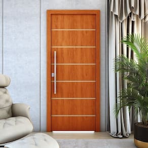 Imagine uma porta que une a beleza clássica da madeira com a praticidade e a uniformidade do MDF, finalizada com um verniz elegante que realça seus detalhes e oferece proteção duradoura, e com um enchimento inteligente que a torna mais leve sem comprometer a sua estrutura.
