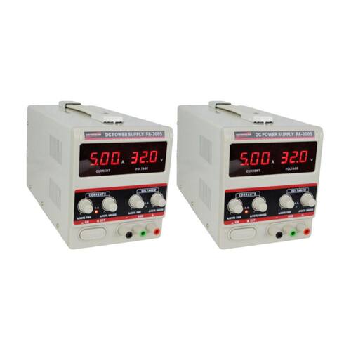 KIT 2 FONTE DE ALIMENTAÇÃO MOD. FA-3005 DIGITAL DE 1 CANAL, TENSÃO ATÉ 32 VOLTS, CORRENTE ATÉ 5 AMPÉRES DESCRIÇÃO: A fonte de alimentação FA-3005 foi especialmente desenvolvida para pesquisas cientificas, desenvolvimento de produto, laboratório, universidades, faculdades, e eletrônica. A tensão e a correntes podem ser reguladas continuamente dentro do valor nominal. Este instrumento é amplamente utilizado devido a sua alta precisão, durabilidade, e seu circuito de proteção de sobrecarga, curto-circuito e inversão de polaridade. DESTAQUES: Circuito de proteção contra sobrecarga, curto-circuito e inversão de polaridade, alça para transporte, bornes de saída compatíveis com pinos banana e forquilha, alimentação bivolt (seleção através de chave). APLICAÇÕES: Pesquisa cientifica, desenvolvimento de produto, laboratório, universidades, faculdades, eletrônica, assistências técnicas, entre outros ESPECIFICAÇÕES TÉCNICAS: Display: LED de 3 dígitos duplo Indicação do método de operação Tensão constante (CV) ou Corrente constante (CC) através de LED Modos de operação Tensão Constante (CV) e Corrente Constante (CC) Método de resfriamento: Ventilação forçada Proteção de entrada: Fusível de vidro Consumo Máximo: 150W Faixa de corrente: 0 a 5 A Precisão: ±2% +2 dígitos Regulação de linha: ?0,2% + 3mA Regulação de Carga: ? 0,2% + 3mA Ripple e Ruído: ?2 mArms Faixa de tensão: 0 a 32V Precisão: ±1% +2 dígitos Regulação de Linha: ?0,01% + 2mV Regulação de Carga: ? 0,01% + 2mV Ripple e Ruído: ?0,5 mVrms Temperatura de Operação: -10 a 40°C Umidade de Operação: ? 90%U.R. Alimentação: 220/127VAC ±10% (chave de seleção);50/60Hz Peso: Aprox. 4,5Kg Dimensões (LxAxP): 260 x 130 x 150mm ACESSÓRIOS FORNECIDOS: 2 - Fonte de alimentação FA-3005 2 - Cabo de alimentação 2 - Manual de instruções 2 - Par de cabos pino banana/jacaré