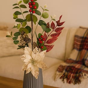 Encante seus convidados com um galho natalino decorativo de eucalipto e berries, que traz harmonia e beleza para qualquer ambiente neste Natal.