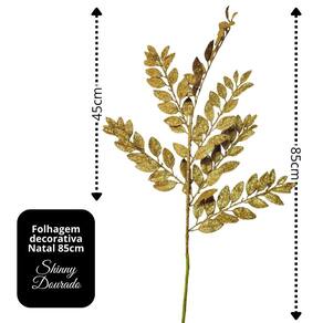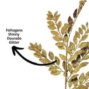 Com acabamento em glitter brilhante na tonalidade dourado, a haste mede 85cm de comprimento total — sendo 45cm de folhagem e 40cm de haste — oferecendo versatilidade para diversas composições decorativas, tanto em ambientes internos quanto em vitrines e espaços comerciais.