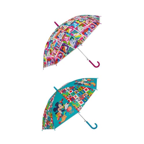 KIT 02 Guardas-chuva Infantil: Sendo 01 Disney Colors e 01 Mickey Mouse. A sombrinha longa automática é ideal para aqueles dias de chuva Ou até mesmo de muito sol Os dias de chuvas são sempre um grande desafio Com temas alegres e divertidos os Guarda chuvas são uma ótima opção para os momentos de passeio.