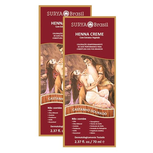 HENNA CREME SURYA BRASIL CASTANHO DOURADO Coloração semipermanente de alta performance para cobertura dos fios brancos. A Henna Creme oferece uma maneira segura e natural para cobrir fios brancos ou tonalizar os cabelso, além de simultaneamente condicioná-los e tonalizá-los mais fortes. Desenvolvida como um tratamento de beleza, sua textura é sedosa e seu aroma é agradável. Produto vegano, com matérias-primas naturais e livres de crueldade, sem nenhum ingrediente de origem animal e sem testes em animais. Fácil de aplicar.