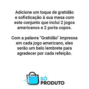 Adicione um toque de gratidão e sofisticação à sua mesa com este conjunto de jogos americanos em plástico Gratidão. Com 4 peças, o conjunto inclui 2 jogos americanos e 2 porta copos.