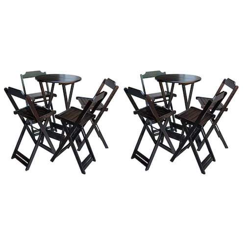 Kit 2 Jogos De Mesa Bistrô De Madeira Com 4 Cadeiras Dobravel Ideal Para Bar E Restaurante Tabaco é ideal para bares, restaurantes, estabelecimentos, áreas de lazer e tambem para sua casa. Feito em madeira maciça, tornando resistentes e duráveis. Seu design permite que seja encaixado em qualquer ambiente, trazendo um toque a mais para seu estabelecimento. Além de sua durabilidade, o que lhe trará conforto para servir seus clientes. Por ser dobrável torna-se mais fácil guardar, manusear e limpar o produto. Atenção: EVITE USAR PRODUTOS ABRASIVOS E QUíMICOS PARA LIMPEZA DO PRODUTO, aconselha-se o uso de pano umedecido para melhor conservação; mantenha o produto fora de chuva e sol constantes. OBS: MDF ULTRA MESA Cor: Tabaco Modelo: Bistrô Dobravel Dimensões: Altura 99cm | Largura 55cm | Profundidade 55cm CADEIRA Cor: Tabaco Modelo: Bistrô Dobravel Dimensões: Altura 100cm | Largura 38cm | Profundidade 37cm