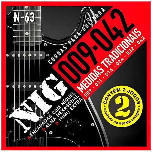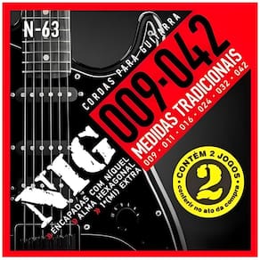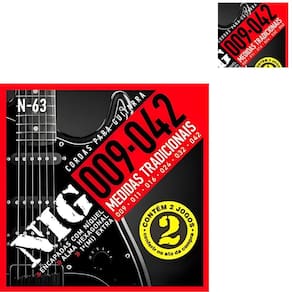 Kit 2 Jogos Encordoamento Guitarra Nig N-63 .009 - 042” + BrindeAs cordas Nig proporcionam o timbre e brilho que você procura para o seu violãoEncapadas com níquel.Alma hexagonal..Especificações:Medidas: 029”/.044”Alta TensãoAcabamento Com BolinhaAcabamento: ClássicoCalibres e Tensões Internacionais;Mais som, brilho e durabilidade;Alta tensão nas cordas;41º Corda extra em todos os jogos.Espessura 009/ 011/ 016/ 024/ 032/ 042. Itens Inclusos:Embalagem Econômica contem 2 jogos de cordas completos2 Cordas (1º Mi Extra)2 Palhetas *Imagens Ilustrativas*