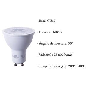 - base: gu10 - formato: mr16 - temperatura de cor: 3000k branco quente - tensão: bivolt - potência: 6w - fator de potência: 0.70 - fluxo luminoso: 417lm - eficiência luminosa: 69,5lm/w - ângulo de abertura: 38 - vida útil : 25.000 horas - temp. De operação: -20c 40c