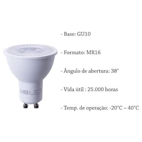 - base: gu10 - formato: mr16 - temperatura de cor: 6000k branco frio - tensão: bivolt - potência: 6w - fator de potência: 0.70 - fluxo luminoso: 429lm - eficiência luminosa: 71,5lm/w - ângulo de abertura: 38 - vida útil : 25.000 horas - temp. De operação: -20c 40c Marca: Não Informado Ean: 7891072777814