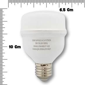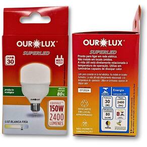Kit 2 lampadas superled alta potencia ourolux 30w e27 6500k Lampada superled alta potencia ourolux t30w e27 6500k Descrição do produto Ilumine seu espaço com eficiência e estilo o superled alta potência ouro 30t 6500k é a escolha perfeita para quem busca uma iluminação potente e clara. Com uma temperatura de cor de 6500k, ele oferece uma luz branca fria que é ideal para ambientes de trabalho, escritórios, garagens e muito mais. Características - alta potência bivolt: proporciona uma iluminação intensa, garantindo visibilidade em grandes áreas. - longa durabilidade: vida útil prolongada, diminuindo a necessidade de trocas frequentes. - fácil instalação: design prático que se adapta a diferentes tipos de luminárias. - tamanho do produto: 10cm altura x 6cm largura x 7cm de diametro. - : 3 meses - composição: polímero termoplástico, metal e componentes eletrônicos. - certificação: inmetro - cor: branco frio - base de conexão: e27 - fluxo luminoso: 2400 lm - eficiência energética: 80 lm/w - potência: 30w Vantagens - longa vida útil: menos trocas e manutenção. - sustentável: menor impacto ambiental em comparação com lâmpadas convencionais. - design moderno: se adapta a qualquer decoração. Aplicações Perfeito para escritórios, lojas, fábricas, ou qualquer ambiente que necessite de iluminação clara e eficiente. Marca: Não Informado