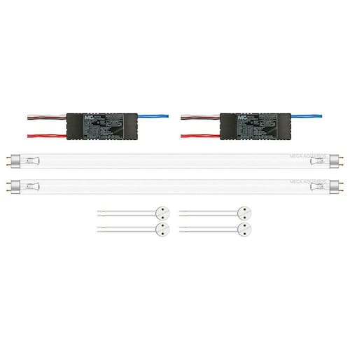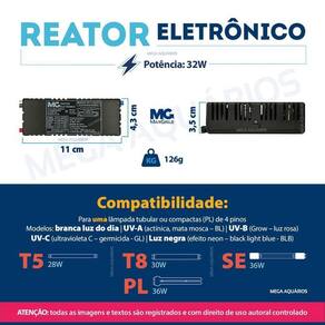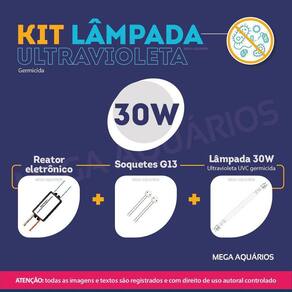 Kit lâmpada uv uv-c 30w tubular t8 germicida para esterilização de ambientes e água + reator próprio para lâmpada uv + par de soquetesLeia atentamente o anúncio antes da compraComposição do kit: 2 lâmpadas germicida de 30w t8 uv-c.2 reatores margirius 32w.4 soquetes base g13.Nossa lâmpada tubular germicida uv foi desenvolvida com tecnologia de ponta para garantir a mais alta qualidade e eficiência em desinfecção, é a escolha ideal para garantir um ambiente livre de germes e uma água cristalina para seu aquário ou lago.Principais características da lâmpada uv-c:Eficácia comprovada na eliminação de bactérias, vírus e outros micro-organismos nocivosA lâmpada uv-c germicida é uma poderosa ferramenta para manter ambientes saudáveisDeixa a água cristalina do lago ou aquário Pode ficar ligada 24h por diaTubular / linearTubo de quartzo transparente4 pinos, dois em cada pontaNecessita de equipamento próprio para desinfecção de ambientes ou um filtro uv para esterilização de águaNunca manuseie a lâmpada com ela ligada, não exponha olhos e pele à radiação da lâmpada. Aplicação - para que serve a lâmpada ultravioleta - uv-c germicida:Manter a água do aquário ou lago cristalina e livre de micro-organismos que possam prejudicar a saúde dos peixes e plantas.Tratamento de água e esgoto.Desinfecção de ambientes como hospitais, farmácias, restaurantes, academias, transporte público, indústrias alimentícias e outros locais que necessitam manter o ambiente seguro e livre de patógenos.Especificações técnicas lâmpada uv-c:Marca: mega aquáriosModelo: lâmpada uv uv-c germicida fluorescente ultravioleta 30wRadiação: emite radiação uv de onda com um pico de 253.7 nm uv-c Potência: 30wVoltagem: 110v / 220v pode ser ligada nas duas voltagens conforme ligação do reatorTamanho: 90cm pino a pinoDiâmetro: t8Soquete: g13Pinos: 4Formato: tubularMédia de vida útil: 8.000hPeso: 101g.Especificações e características soquete para lâmpada t8: Funciona com todos os modelos de lâmpadas de diâmetro t8, t10, t12 e lâmpadas de led desse diâmetroMarca: redyModelo: soquete base g13 tomadinha para lâmpada t8Base: g13Material: corpo em plástico pp polipropileno e contatos em latãoCorrente: 2aVoltagem: 110v ou 220v conforme ligação do reatorCor: brancoTamanho: 2,2cm de diâmetroRabicho: 12cm fio flexível 0,5mmTemperatura máxima de trabalho: 70cPeso unitário: 6g.Especificações técnicas reator para lâmpada uv:Para lâmpada de 4 pinos fluorescentePartida instantânea30% mais econômico em relação aos modelos eletromagnéticosFabricante: margiriusModelo: pg 1x32 af3Voltagem: pode ser ligado em 110v ou 220vDimensões: 11 x 3,5 x 4,3cm larg x alt x profundidadePeso: 126gCorrente: 0,29a 127v / 0,17a 220v Potência: 35w 127v / 35w 220v Temperatura máxima de trabalho: 75c.Observações e precauções:A instalação deve ser feita por um profissional especializadoInstalar o reator conforme o esquema de ligação gravado no corpo do produto;Isolar corretamente o fio não utilizadoTrocar a s lâmpada s somente com o reator desligadoNão instalar o reator em ambientes úmidos, sujeito a intempéries ou em locais em que a temperatura ambiente seja inferior a 10ºc ou superior a 45ºc;Não recomendamos aumentar o comprimento dos cabos da s lâmpada s por mais de 2 metros, bem como enrolá-los ou trançá-los entre si ou com outros cabos.ImportanteJamais exponha os olhos ou a pele à radiação emitida pela lâmpada uv ultravioleta, sob risco de danos gravíssimos irreversíveis aos olhos além de queimaduras na pele. A utilização de equipamentos de segurança é obrigatória.Obrigado pela visita e boas comprasAtençãoNossas imagens e textos são registrados e com direito de uso autoral controlado e reservado a essa loja e as lojas parceiras devidamente autorizadas em contrato. Marca: Mega Aquarios