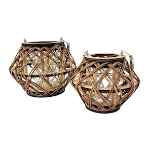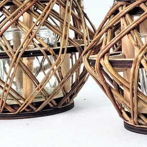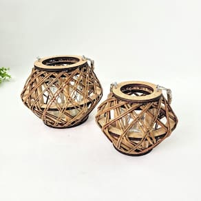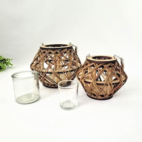 Ambos os castiçais são feitos de madeira com acabamento vazado, permitindo que a luz da vela escape suavemente e crie efeitos visuais encantadores. Cada um possui uma alça de corda que facilita o transporte ou permite pendurá-los, adicionando um detalhe rústico e prático às peças. No interior, há um copo de vidro removível, ideal para acomodar velas não inclusas e garantir a segurança, além de facilitar a limpeza e a troca.