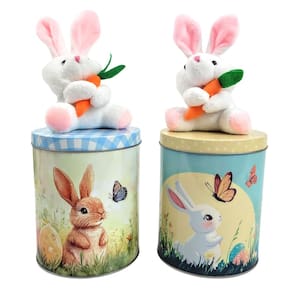 design Encantador: A lata é decorada com um charmoso coelho no topo, ideal para presentear ou decorar sua casa nesta Páscoa. material Resistente: Feita de metal, garante durabilidade e um armazenamento seguro para seus biscoitos e guloseimas. Coelho em pelúcia.