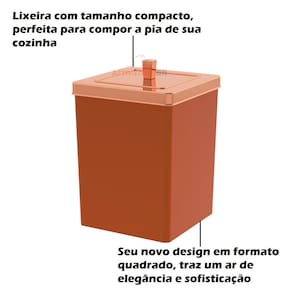 Fabricada totalmente em plástico, em formato quadrado, essa lixeira é perfeita para ser utilizada sobre a pia ou bancada de sua cozinha, banheiro ou em ambiente corporativo. Tampa com abertura manual por meio de pino, permite deixar o saquinho de lixo fixo e não aparente, já que possui um aramado interno.