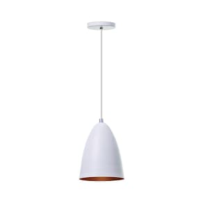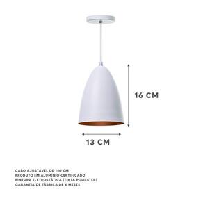 Características: - Pendente modelo bala - dimensões: 16x13cm - canopla redonda de 11cm de diâmetro - produto feito em alumínio - 150cm de fio ajustável - pronto para instalação - utilize a lâmpada que desejar - soquete e-27 - garantia de 6 meses contra defeitos de fabricação - cor: branco - lâmpadas não inclusas neste produto.