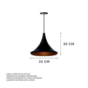 - dimensões: 25x33cm - canopla redonda de 11cm de diâmetro - produto feito em alumínio - 150cm de fio ajustável - pronto para instalação - utilize a lâmpada que desejar