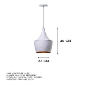 Especificações Técnicas: Marca: Ideallume Modelo: Balão Fixação: Teto Tipo de uso: Interno Pintura: Eletrostática - Tinta: microtextura poliéster Cor: Branco Com Cobre Material : Alumínio Voltagem Do Pendente: Bivolt 110/220v Soquete: E27 Medidas L x A x D : 23 x 30 x 23 cm Lâmpada: Utiliza 1 lâmpada Não inclusa