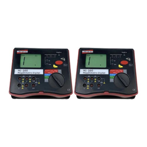 KIT 2 MEGÔHMETRO DIGITAL PORTATIL FAIXA 5000V E 200 GIGAOHMS MOD. MI-500 DESCRIÇÃO: Megôhmetro digital portatil faixa 5000v e 200 gigaohms mod. mi-500 ESPECIFICAÇÕES TÉCNICAS: Display: cristal líquido (LCD) de 3 ½ dígitos Escala: Resistência: 0 a 200G? Tensão de teste: 1000 / 2500 / 5000V Tensão de saída: 90% - 110% da tensão de teste Resolução: 0.01M? Precisão: 0 a 200M? ± (3% leitura + 5 dígitos) 200M? a 10G? ± (5% da leitura + 5 dígitos) 10G? a 200G? ± (10% da leitura + 5 dígitos) Mede frequência de fase Conversão automática de escala (teste de isolação) Categoria: CAT II - 600V Data Hold Indicação de pilha fraca Iluminação do display Temperatura de operação: 0° a 40°C Umidade de operação: <80% UR Temperatura de armazenamento: -10° a 50°C Umidade de armazenamento: <80% UR Alimentações: 8 pilhas de 1,5 "AA" Dimensão do display: 65 x 48mm (dígito: 29mm de altura) Dimensões: 190 x 155 x 75mm Peso: 900g (com pilhas) ACESSÓRIOS FORNECIDOS: 2 - Megôhmetro digital MI-500 2 - Maleta para transporte 16 - Pilhas de 1,5 "AA" Pontas de prova para medição de sequência de fase Pontas de prova para medição de resistência de isolação Manual de instruções