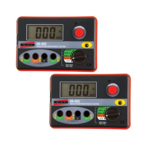 KIT 2 MEGÔHMETRO DIGITAL PORTATIL FAIXA 2500V E 20 GIGAOHMS MOD. MI-400 DESCRIÇÃO: Megôhmetro digital portatil faixa 2500v e 20 gigaohms mod. MI-400 ESPECIFICAÇÕES TÉCNICAS: Display de Cristal líquido LCD de 3½ dígitos, o valor máximo de exibição no display é de 1999. Escala: 0 - 20G? Tensão de Teste: 500V/1000V/2500V Tensão de saída: Tensão de teste de 90 a 110% Divisão mínima: 0,01M? Precisão: 0 a 200M? ±(3% de leitura + 2 dígitos significantes) 200M? a 1000M? ±(5% de leitura + 3 dígitos significantes) 1000M? a 20G? ±(10% de leitura + 5 dígitos significantes) Tensão AC: 0 a 700V Precisão: ±(1,5% de leitura + 5 dígitos significantes) Categoria: CAT II - 600V Função DATA HOLD: Congela a leitura no display Temperatura de Operação: 0 - 40ºC Umidade de Operação: < 80%UR Alimentação: 6 pilhas de 1,5V tamanho AA Dimensões: 150 x 100 x 70mm Peso: 680g(incluindo pilhas) ACESSÓRIOS FORNECIDOS: 2 - Megôhmetro digital Mi-400 2 - Ponta de prova com sensor (vermelha) 2 - Ponta de prova blindada com adaptador jacaré 2 - Ponta de prova tipo jacaré 12 - pilhas de 1,5V “AA” 2 - Estojo para transporte Manual de instruções