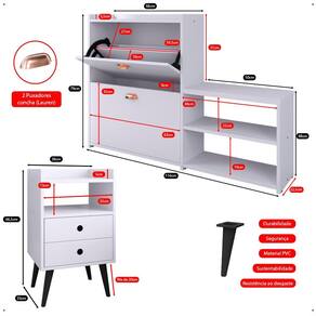 Praticidade e sofisticação para o seu quarto! A Mesa de Cabeceira Dream combina design clean com funcionalidade, oferecendo duas gavetas amplas, nicho e um tampo espaçoso para acomodar objetos decorativos e itens de uso diário. Já a Sapateira Milano une elegância e organização, com capacidade para até 21 pares de calçados, duas gavetas basculantes, banco lateral e prateleira para armazenamento extra.