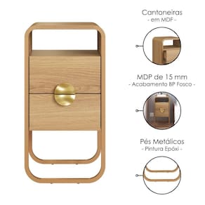 Kit com 2 Mesas de Cabeceira Luna, idealizadas a partir de formas orgânicas com cantos arredondados que se entrelaçam ao seu ambiente de repouso. Contam com estrutura em MDP de 15 mm, com acabamento BP e pés metálicos (Pintura Epóxi) com sapatas reguláveis em plástico. Possuem gavetas com corrediças telescópicas e puxadores em poliestireno estilo meia lua, além nicho superior, ambos o nicho e gaveta suportam até 2kg cada. Adicionalmente, são constituídas por cantoneiras em MDF. Produto será entregue em 02 volumes.