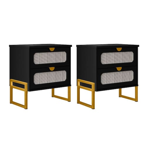 Tipo: Mesa de Cabeceira Modelo: Titanium Cor: Preto Cor da Base: Dourado Estrutura: MDP com acabamento em pintura UV Pés: Metal com pintura eletrostática Possui 2 gavetas: Corrediças metálicas Frentes decorativas em padrão rattan Puxadores embutidos Design: Moderno, funcional e elegante Garantia: 3 meses contra defeitos de fabricação