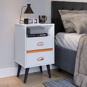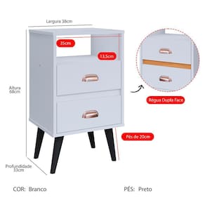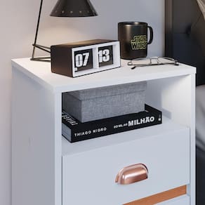 Conta com duas gavetas, nicho e um amplo tampo a qual pode ser utilizado para acomodar itens decorativos e de uso diário, como: porta-retratos, despertador, livros, entre outros.
