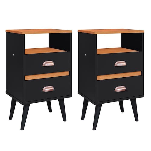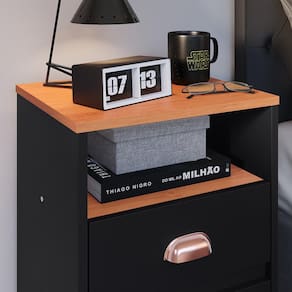 Conta com duas gavetas, nicho e um amplo tampo a qual pode ser utilizado para acomodar itens decorativos e de uso diário, como: porta-retratos, despertador, livros, entre outros.
