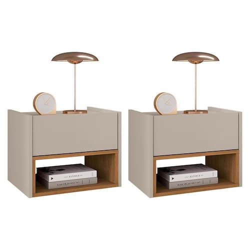 Kit 2 Mesas De Cabeceira Suspensa Florença 1 Gaveta Off White/cedro - Casa D Off White/cedro Kit 2 Mesas de Cabeceira Suspensa Florença 1 Gaveta - Casa D Com design compacto, moderno e funcional, a Mesa de Cabeceira Suspensa Florença é perfeita para otimizar o espaço do seu quarto. Produzida em MDF e MDP com pintura UV, traz elegância e praticidade ao ambiente. Possui 1 gaveta com corrediças telescópicas que garantem abertura suave e durabilidade, além de nicho interno ideal para organizar objetos do dia a dia. Por ser suspensa, facilita a limpeza e proporciona um visual mais leve e contemporâneo ao ambiente. ESPECIFICAÇÕES: - Estrutura em MDF e MDP - Pintura UV - 1 Gaveta - Corrediças telescópicas - Nicho interno - Suspensa