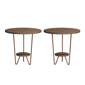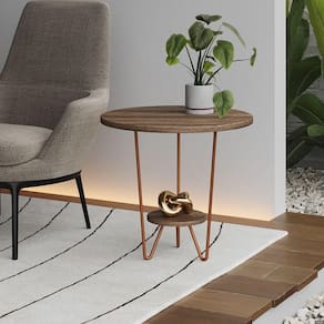 AS IMAGENS SÃO MERAMENTE ILUSTRATIVAS E PODEM SOFRER VARIAÇÕES DE COR E PEQUENOS DETALHES DE ACORDO COM O SEU MONITOR, ILUMINAÇÃO DO AMBIENTE E ATÉ MESMO A SUA PERCEPÇÃO 2 Mesas Laterais Redonda Industrial Italy Ferro Cobre e Tampo AmÃndoa
