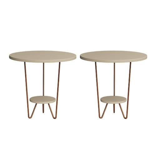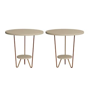 AS IMAGENS SÃO MERAMENTE ILUSTRATIVAS E PODEM SOFRER VARIAÇÕES DE COR E PEQUENOS DETALHES DE ACORDO COM O SEU MONITOR, ILUMINAÇÃO DO AMBIENTE E ATÉ MESMO A SUA PERCEPÇÃO 2 Mesas Laterais Redonda Industrial Italy Ferro Cobre e Tampo Off-white