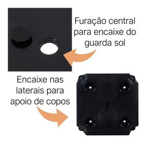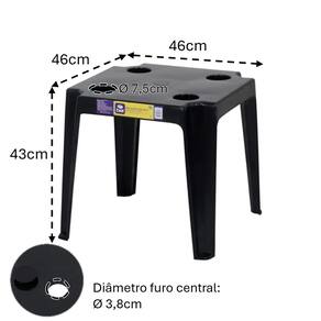 A Mesa Plástica de Apoio com Porta-Copos Preta tem estrutura em polipropileno, suporta até 30kg e tem furação para guarda-sol compatível com haste de até 36mm. A mesinha é fácil de limpar e ocupa pouco espaço ao guardar, podendo ser empilhada se tiver 2 unidades ou mais.