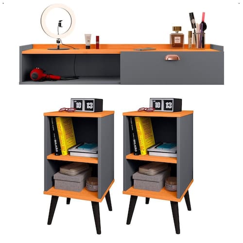 Já a Penteadeira Suspensa Decor otimiza o ambiente sem ocupar espaço no chão, ideal para quartos compactos. Conta com porta e tampo espaçoso, oferecendo espaço perfeito para organizar maquiagens, perfumes e outros acessórios de forma prática e discreta.